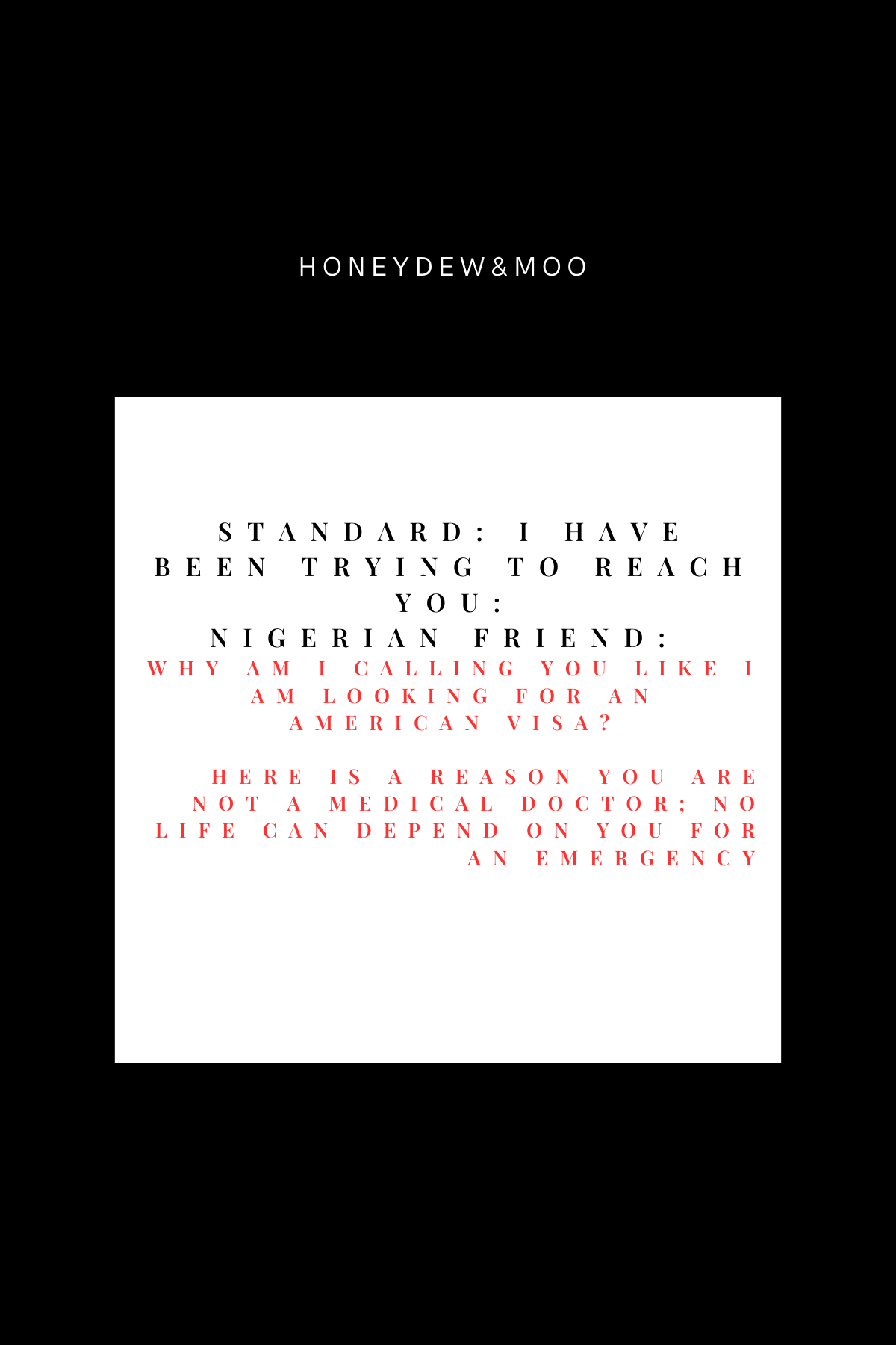 Text: Standard: I have been trying to reach you: Nigerian friend: Why am I calling you like I am looking for an American visa? Here is a reason you are not a medical doctor; no life can depend on you for an emergency