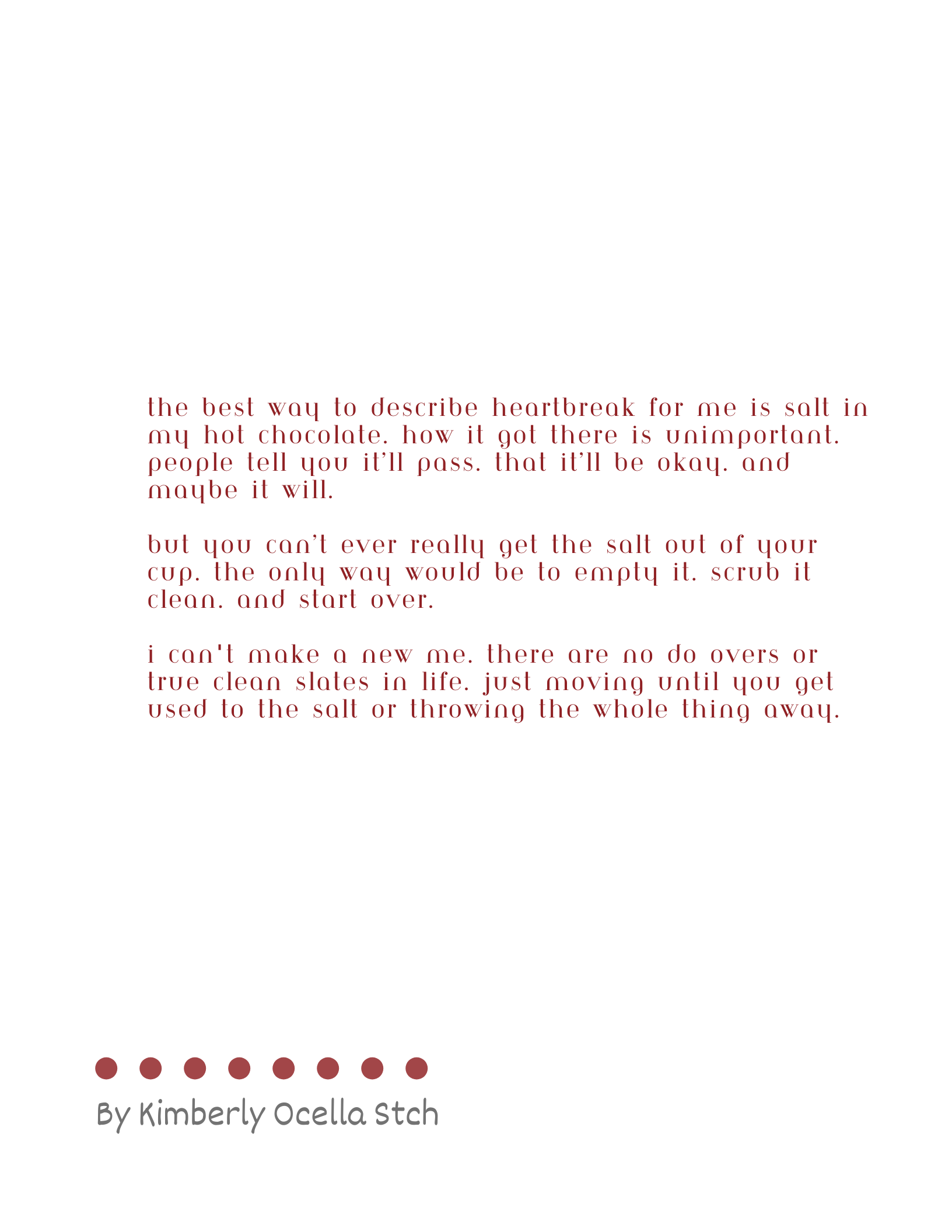Text: The best way to describe heartbreak for me is salt in my hot chocolate. How it got there is unimportant. People tell you it’ll pass. that it’ll be okay. And maybe it will. But you can’t ever really get the salt out of your cup. The only way would be to empty it. scrub it clean. and start over. I can't make a new me. There are no do overs or true clean slates in life. Just moving until you get used to the salt or throwing the whole thing away.
