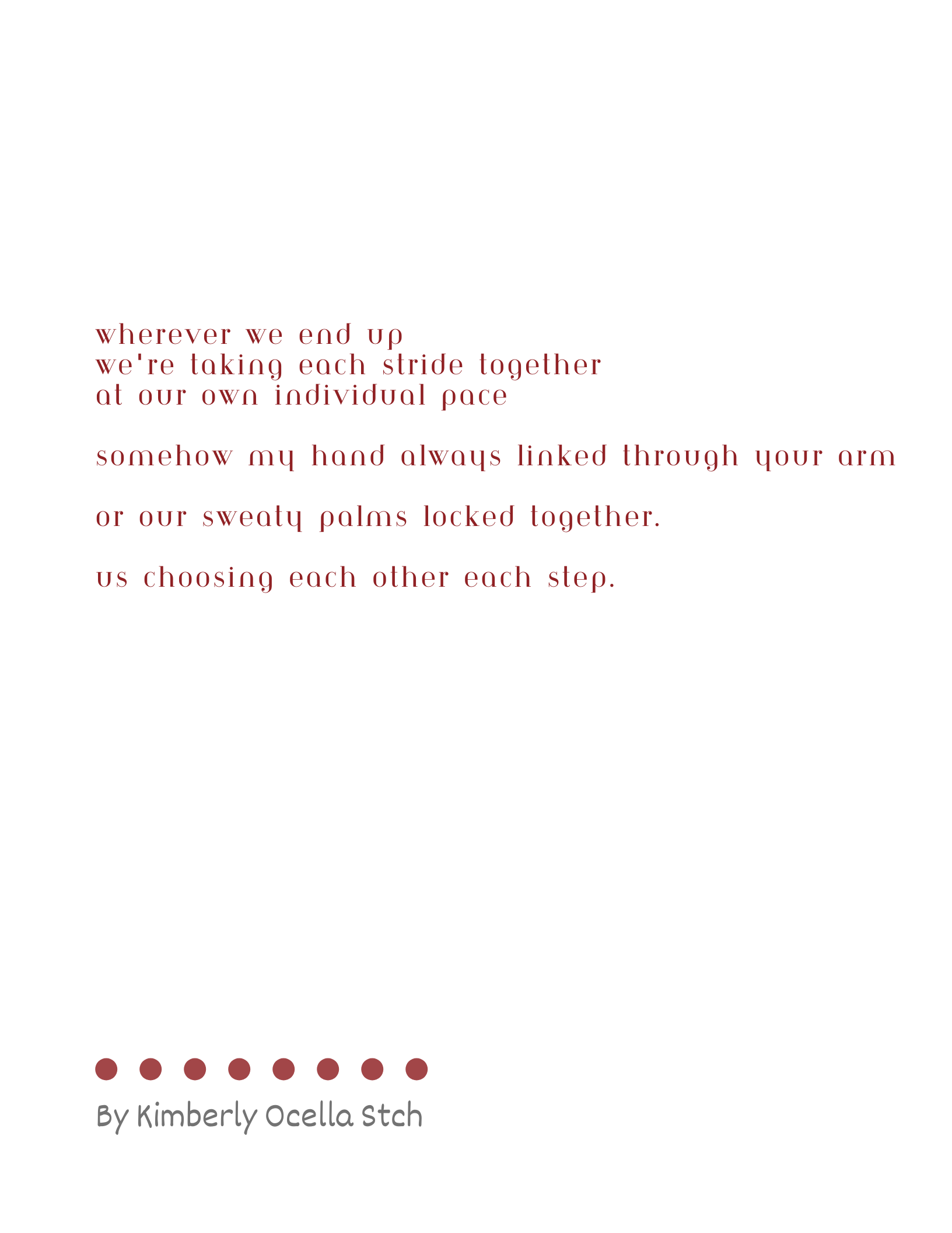 Text: Wherever we end up, we're taking each stride together at our own individual pace, somehow my hand always linked through your arm or our sweaty palms locked together. Us choosing each other each step.
