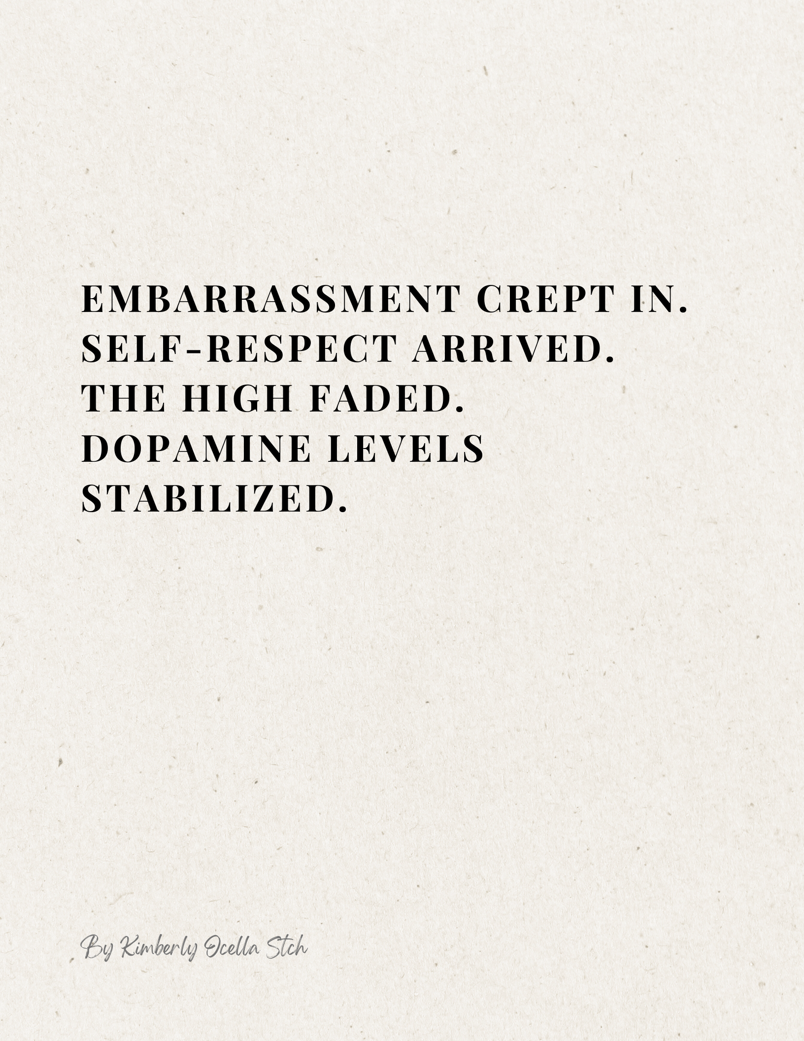 Text: Embarrassment crept in. Self-respect arrived. The high faded. Dopamine levels stabilized.