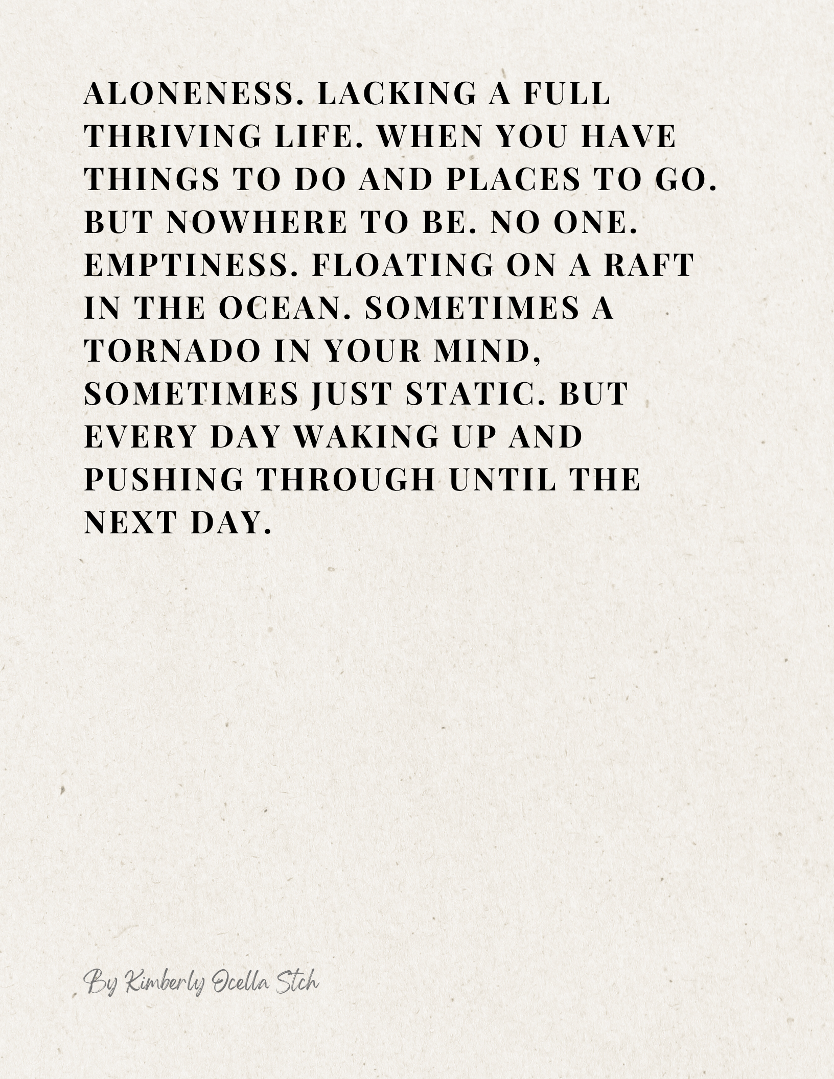 Text: Aloneness. Lacking a full thriving life. When you have things to do and places to go. But nowhere to be. No one. Emptiness. Floating on a raft in the ocean. Sometimes a tornado in your mind, sometimes just static. But every day waking up and pushing through until the next day.