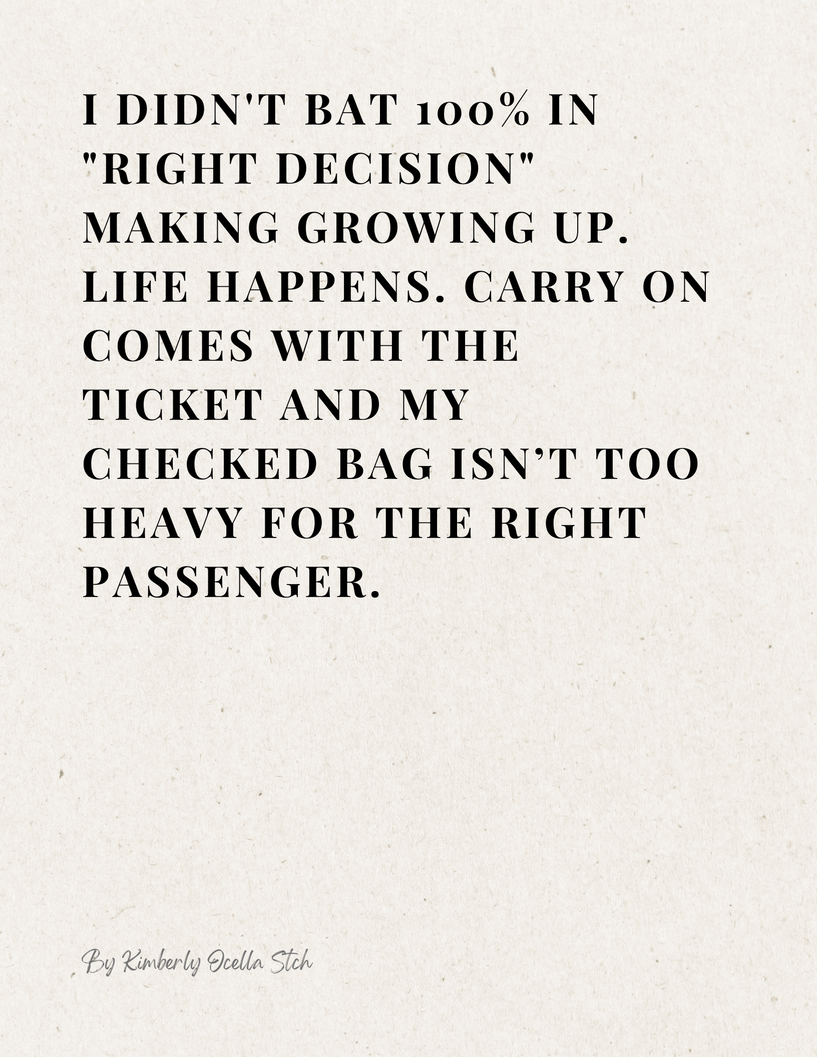Text: I didn't bat 100% in "right decision" making growing up. Life happens. Carry on comes with the ticket and my checked bag isn’t too heavy for the right passenger.