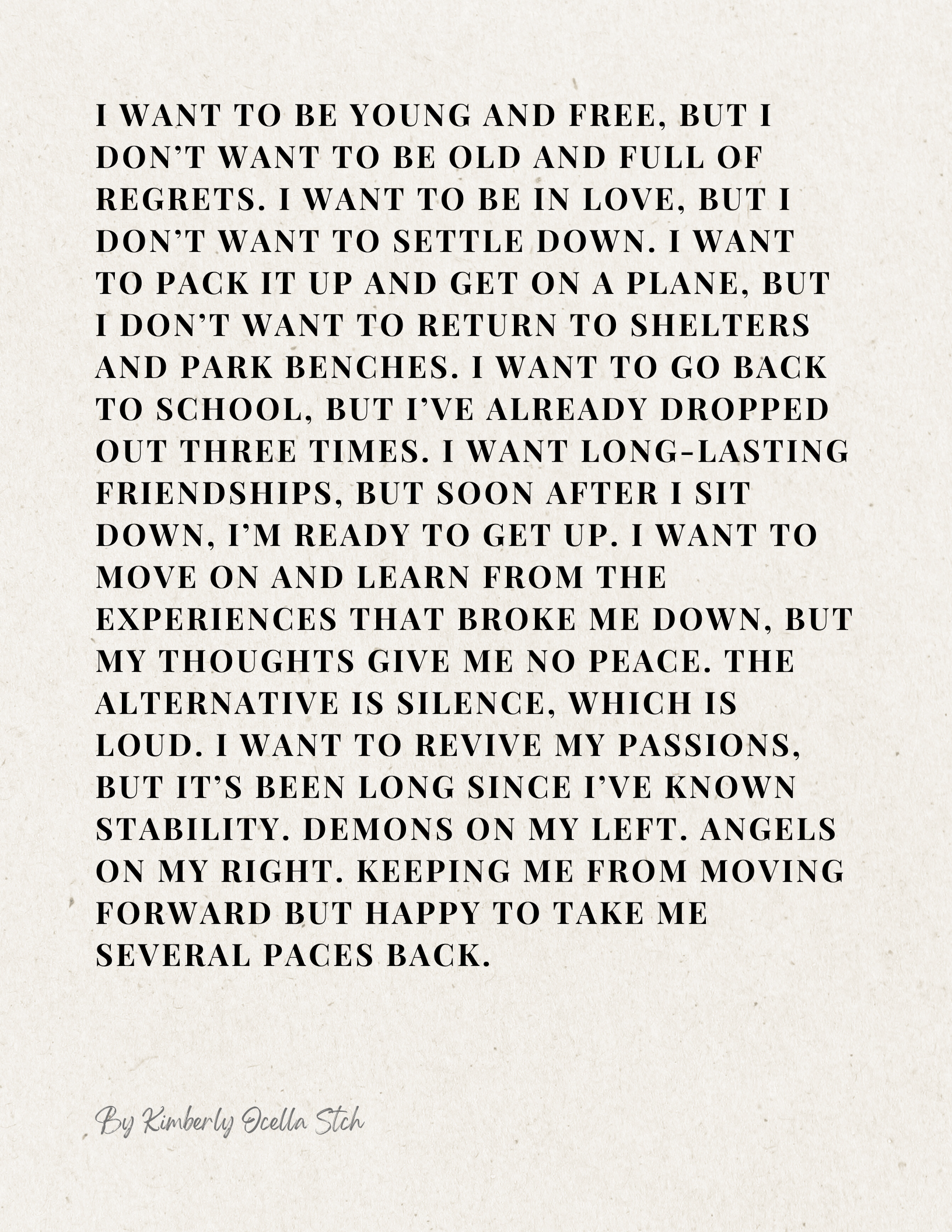 Text: I want to be young and free, but I don’t want to be old and full of regrets. I want to be in love, but I don’t want to settle down. I want to pack it up and get on a plane, but I don’t want to return to shelters and park benches. I want to go back to school, but I’ve already dropped out three times. I want long-lasting friendships, but soon after I sit down, I’m ready to get up. I want to move on and learn from the experiences that broke me down, but my thoughts give me no peace. The alternative is silence, which is loud. I want to revive my passions, but it’s been long since I’ve known stability. Demons on my left. Angels on my right. Keeping me from moving forward but happy to take me several paces back.