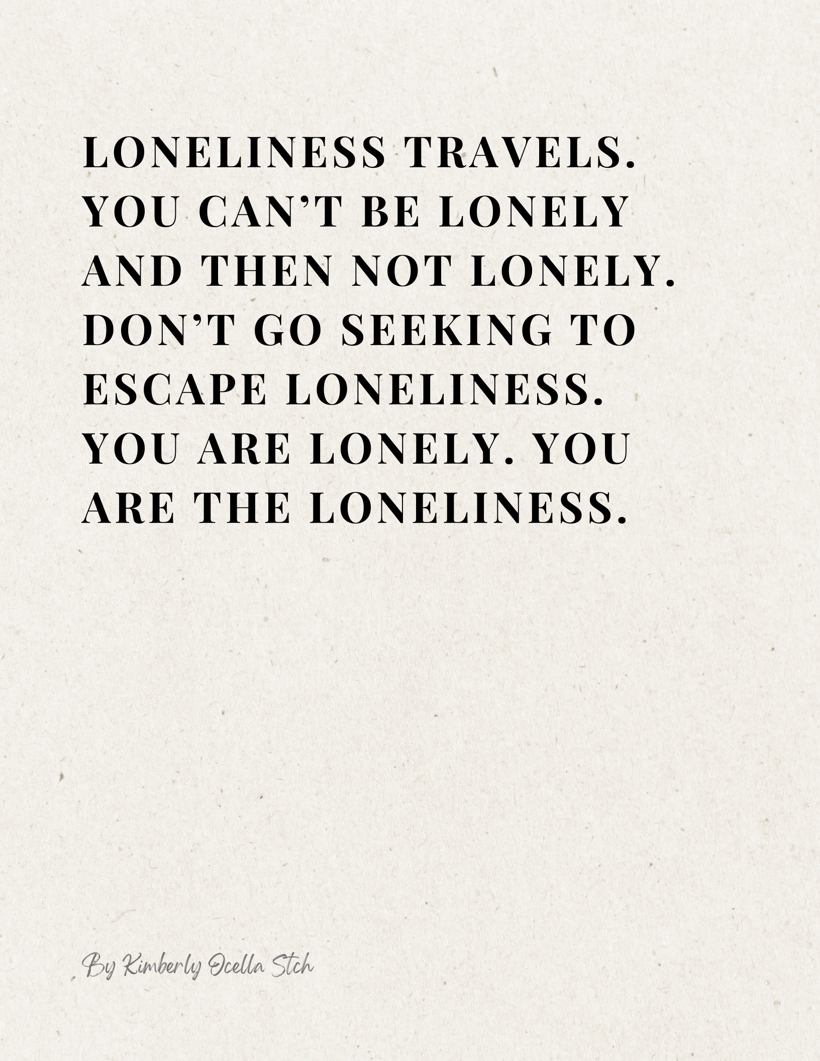 Text: Loneliness travels. You can’t be lonely and then not lonely. Don’t go seeking to escape loneliness. You are lonely. You are the loneliness.