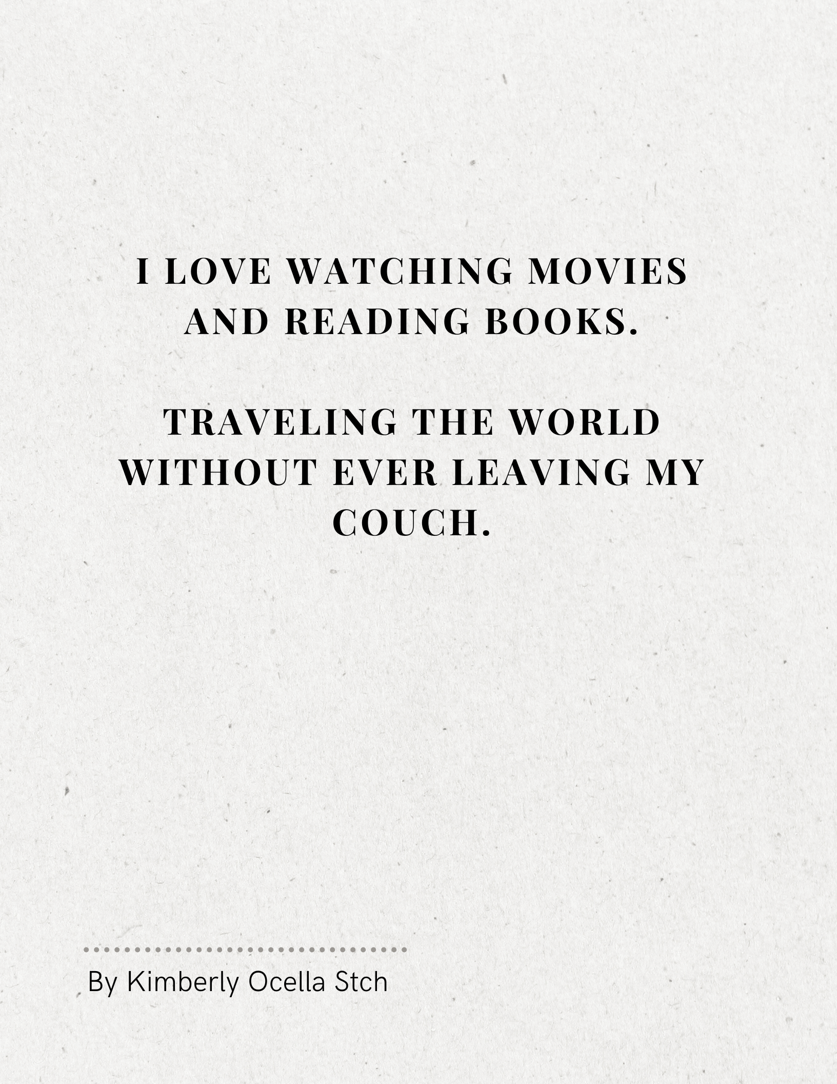 Text: I love watching movies and reading books. Traveling the world without ever leaving my couch.