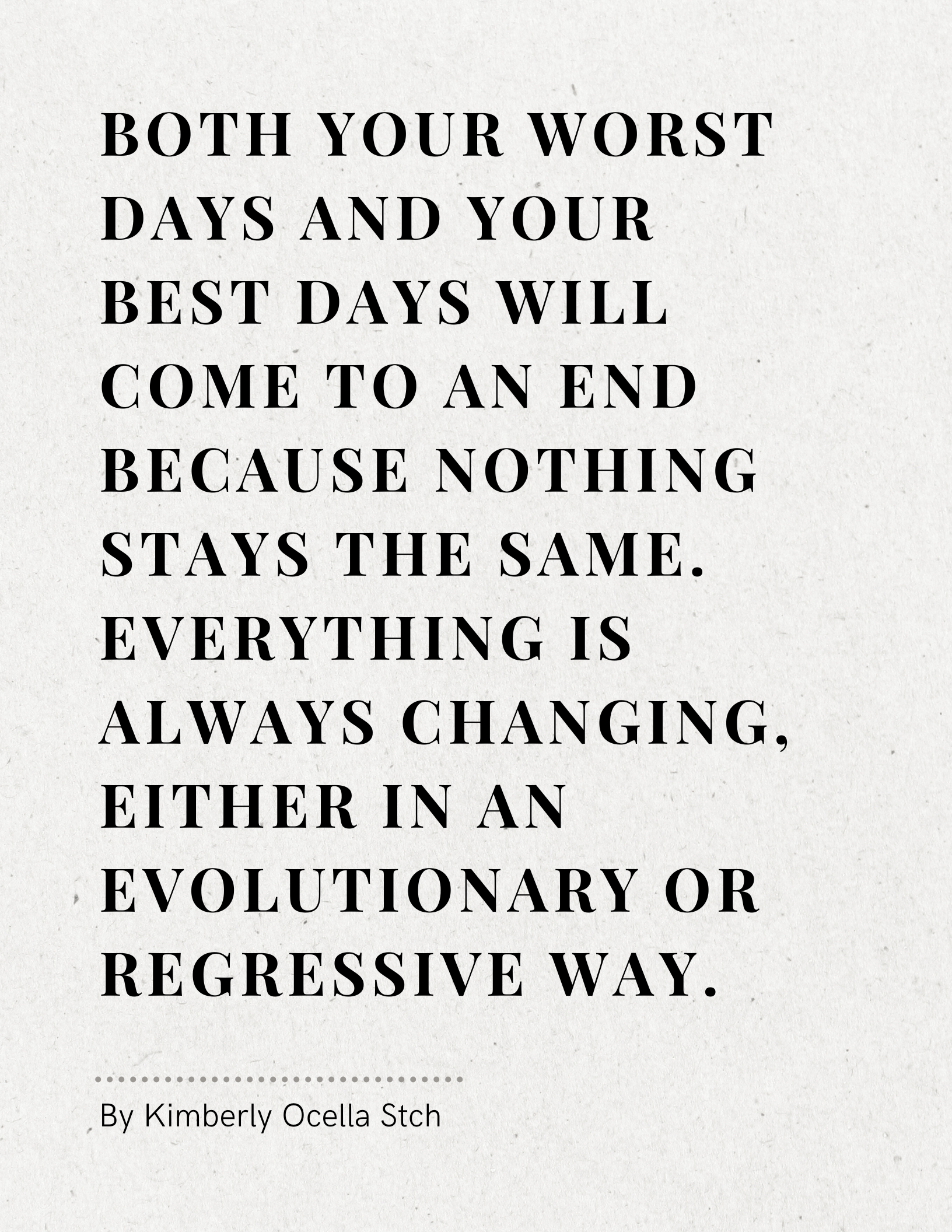 Text: Both your worst days and your best days will come to an end because nothing stays the same. Everything is always changing, either in an evolutionary or regressive way.
