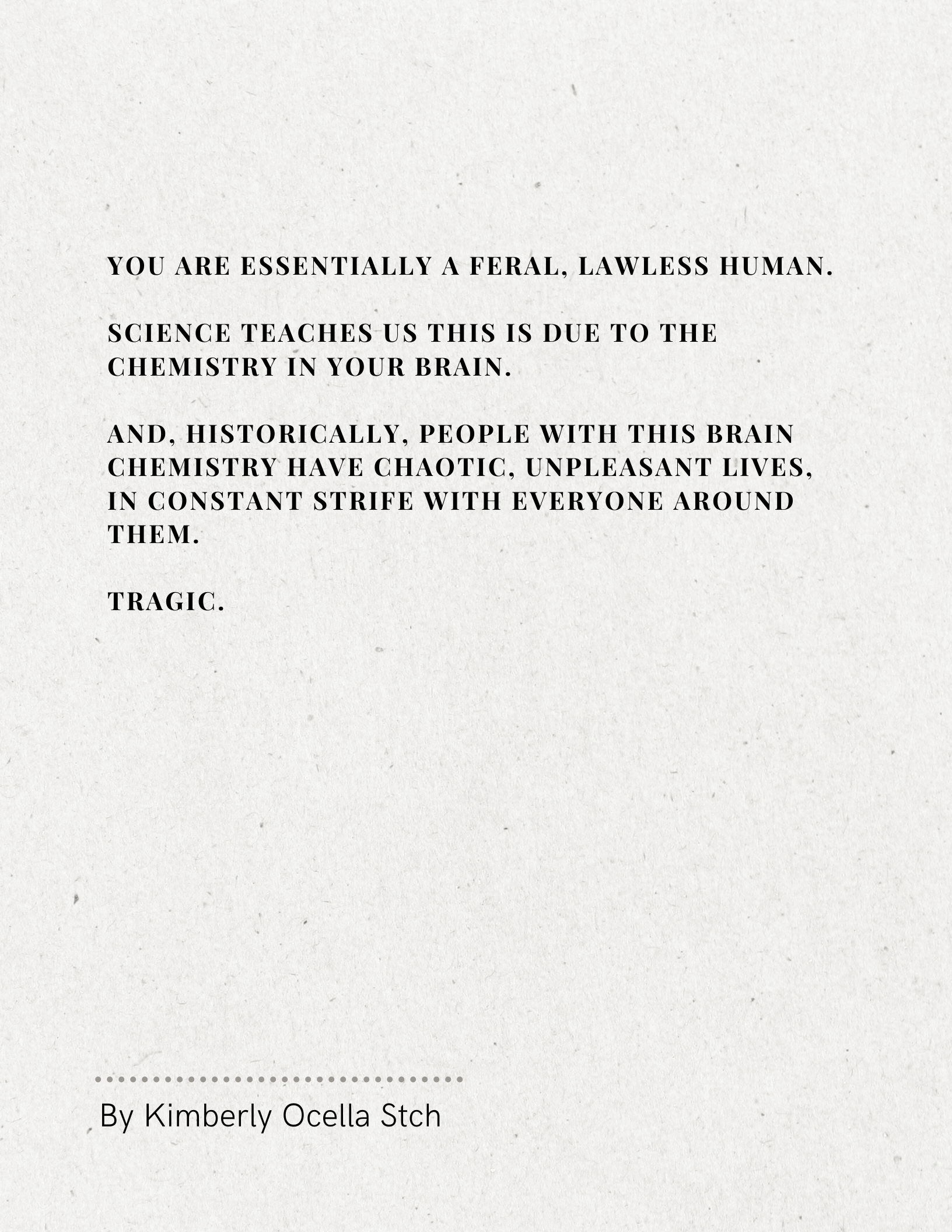 Text: You are essentially a feral, lawless human. Science teaches us this is due to the chemistry in your brain. And, historically, people with this brain chemistry have chaotic, unpleasant lives, in constant strife with everyone around them. Tragic.