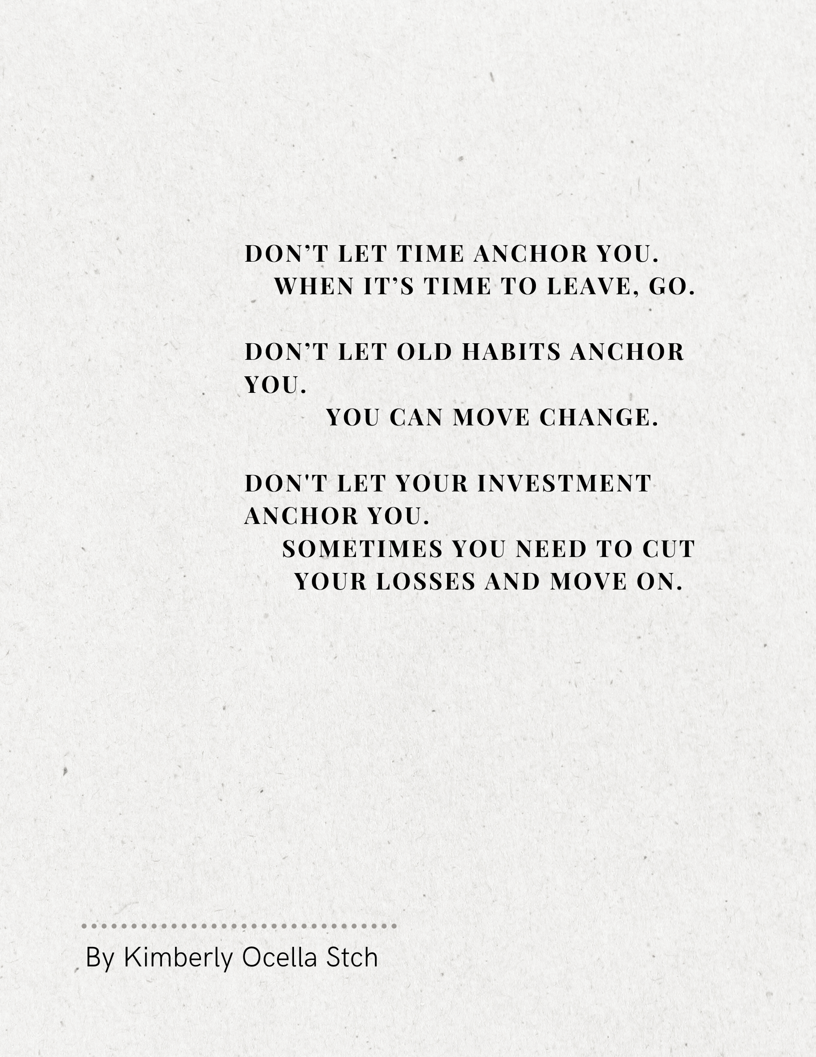 Text: Don’t let time anchor you. When it’s time to leave, go. Don’t let old habits anchor you. You can move on and become a new person. Don't let your investment anchor you. Sometimes you need to cut your losses and move on.